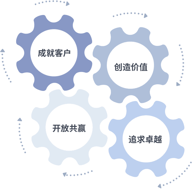 成就客户是一切决策的出发点,,,创造价值是衡量所有工作的标准,,追求卓越是我们做事做人的态度,,,开放共赢是我们的格局也是最终的结果。。。。价值观的齿轮环环相扣,,推动着组织里的每个人不断向前。。。